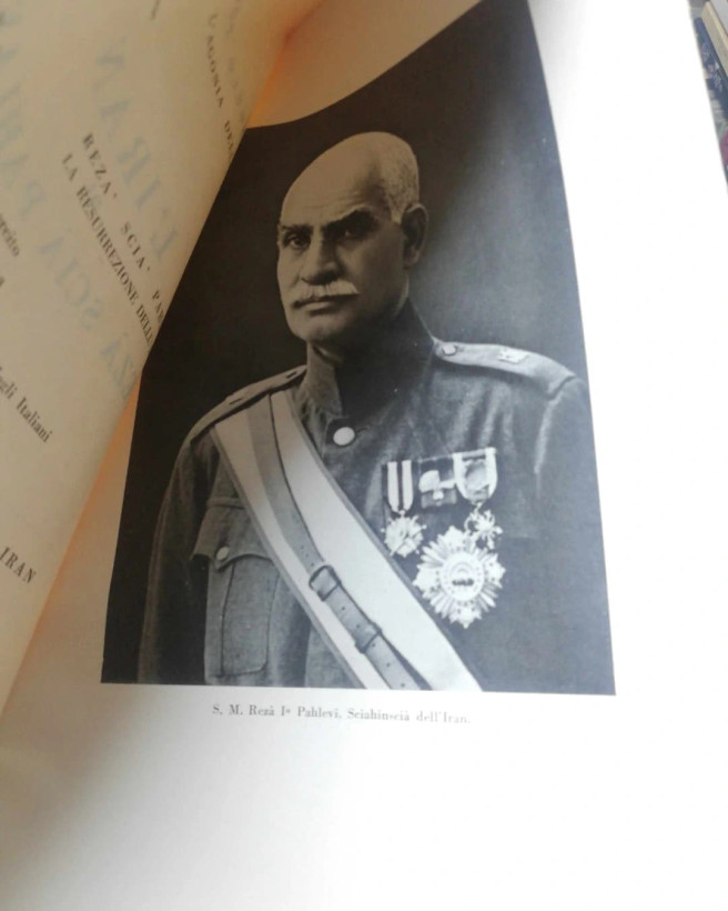 رضا شاه و خدمات او. چاپ ایتالیا. مصور